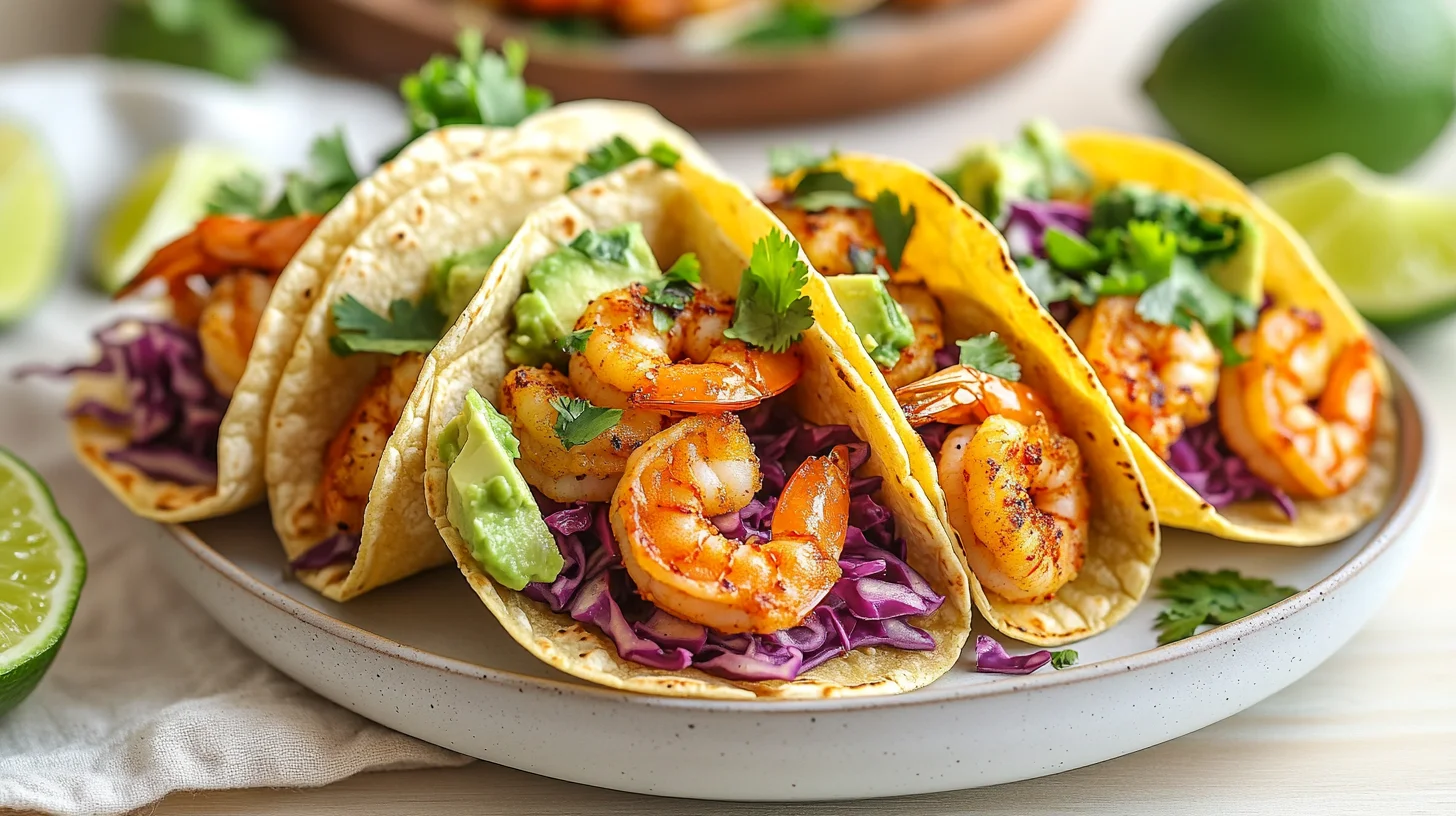 Air fryer shrimp tacos feature succulent shrimp seasoned with chili, cumin, and lime, then crisped to tender perfection in an air fryer. Served in warm corn tortillas with crunchy cabbage slaw and creamy chipotle crema, this meal feels like a restaurant-quality dinner in under 20 minutes.