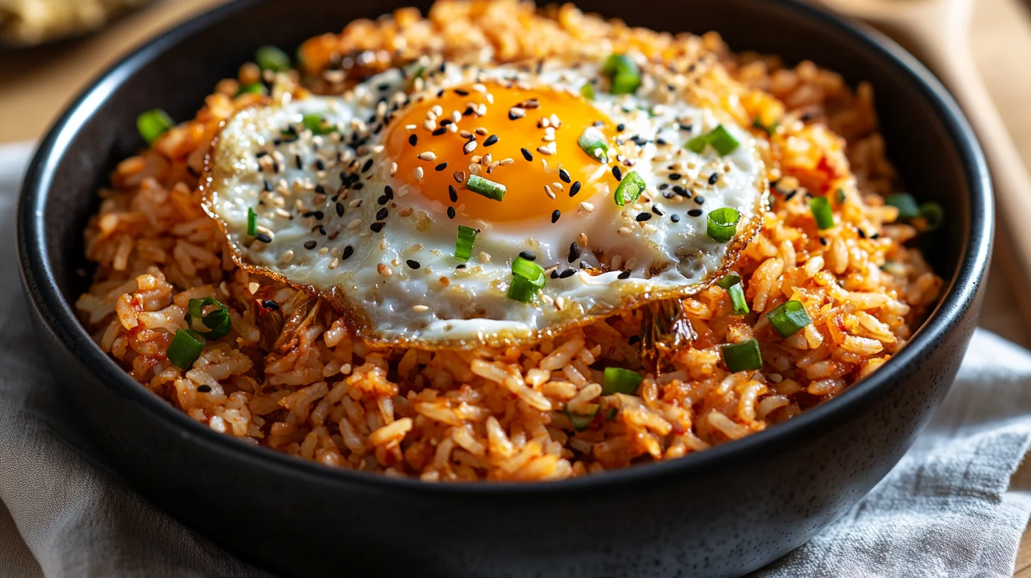 A fried rice dish where kimchi (fermented spicy cabbage) provides both tang and probiotics. The rice is stir-fried with kimchi, oil, seasonings, and often topped with a fried egg. Using leftover, day-old rice ensures the best texture. It’s considered “gut-friendly” because kimchi contains live cultures that support digestion.