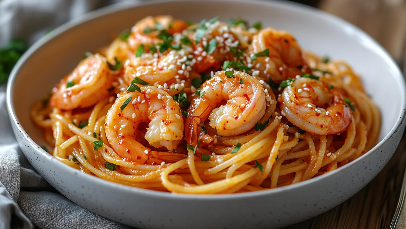 A Korean-Italian fusion that brings gochujang heat to classic shrimp scampi. This 25-minute pasta dish features plump shrimp in a spicy garlic butter sauce tossed with spaghetti — easy enough for weeknights, impressive enough for guests.